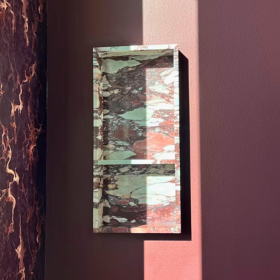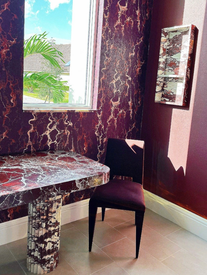 This office is a space designed for true creativity and expression. It feautures bespoke furniture crafted from Calacatta Viola and Rosso Levanto marble pairs with marble window sills for a seamless sense of luxury.