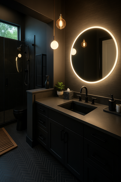 This space was part of a full-scale residential design project, where we collaborated with our clients on every detail from the initial layout to tile selection and the final finishes. The all-black palette creates a bold, sculptural atmosphere, while layered ambient lighting brings depth, warmth, and dimension to the space.